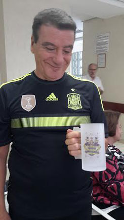Foto de José Augusto, filho de José de Castro Miceli, com a caneca de Chopp que foi sorteada no evento.