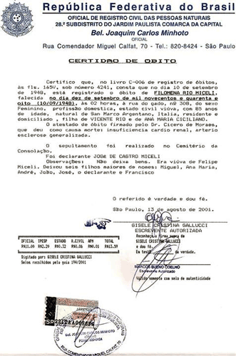 Certidão de óbito de Filomena Rio, Esposa de Felippo Maria Miceli.