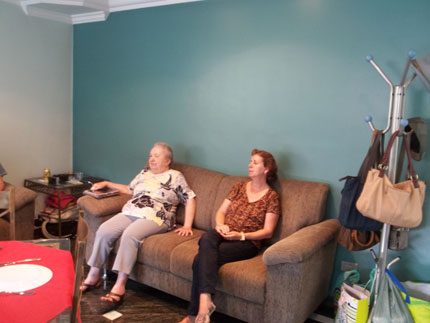 Lydia sentada aguardando os parentes para o evento ao lado de sua cunhada