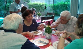 Foto dos familiares degustando a entrada, brusqueta feita com muito carinho, Dalva, Beatriz, Helmut, Maria Lucia, Andrea, Everaldo e Dionéia.
