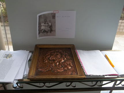 Foto da mesa da entrada para que os familiares vissem o quadro confeccionado por André Miceli (artesão) e com foto do quadro na casa da Penha, ao lado do livro e das fotos do brasão e histórico do brasão e algumas árvores genealógicas para dar a alguns participantes.